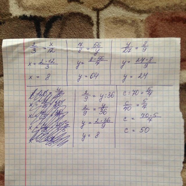 Решить уравнение 2\3=х\12 7\8=56\у у\27=8\9 х-20=4\5 2\9=у÷36 с÷70=5\7 пожалуйста очень нужно правильное решения.