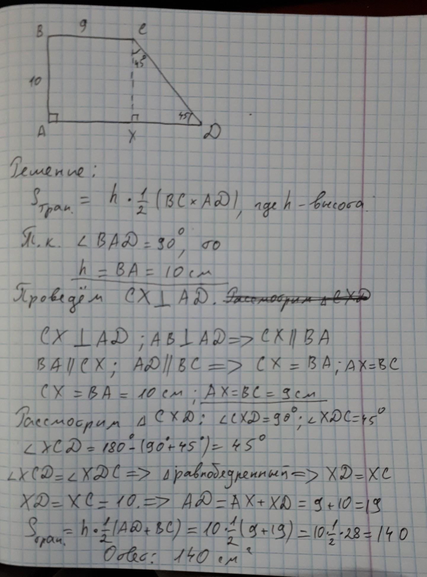 Дана прямоугольная трапеция, меньшее основание которой равна 9 см. Меньшая боковая сторона равна 10 см, а большая боковая сторона образует с основанием угол 45 градусов