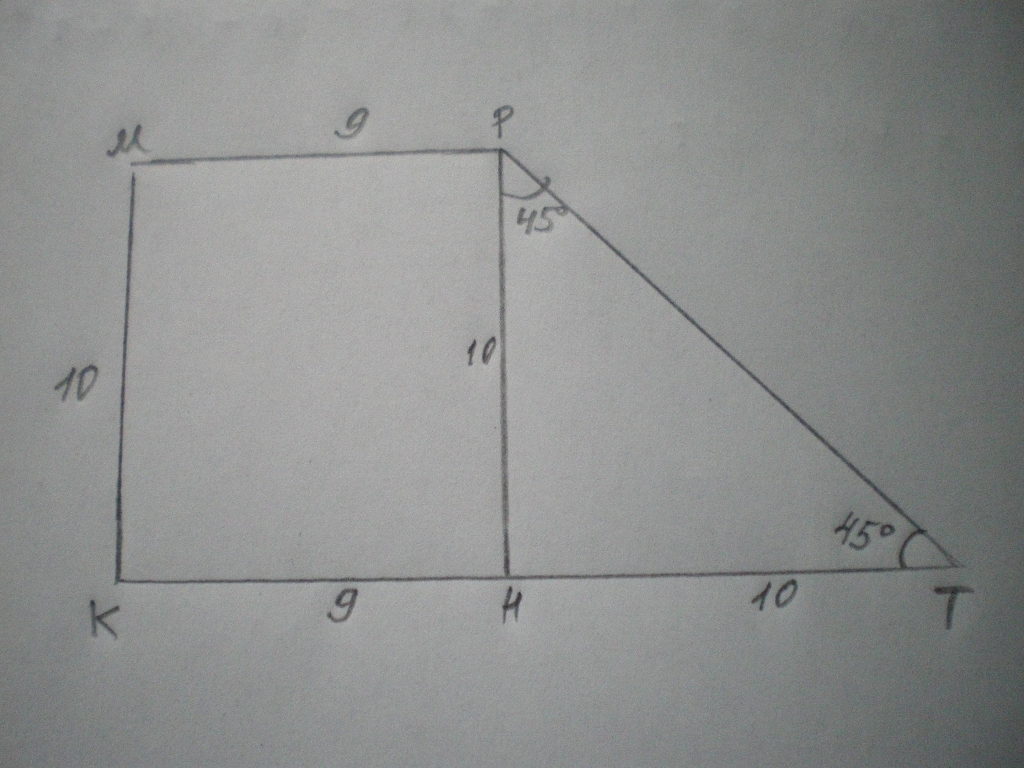Дано: КМРТ - трапеция, ∠К=∠М=90°, МР=9 см, КМ=10 см, ∠Т=45°. Найти S(КМРТ).
