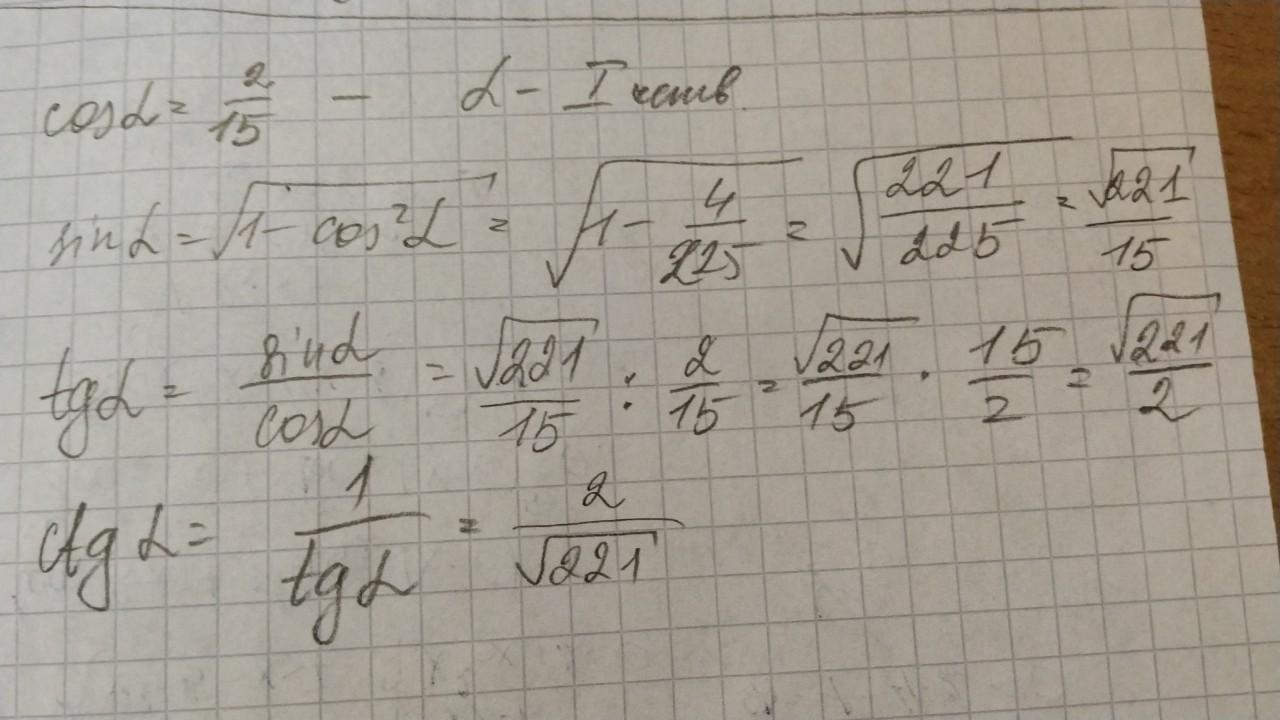 Для острого угла а найдите sin a , tg a , ctg a если cos a = 2/15(дробь)