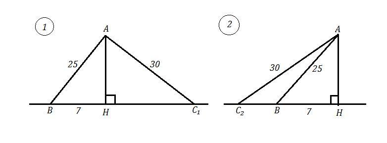 Из точки А к прямой в проведены 2 наклонные АВ 25 см и АС 30 см. Найдите проекцию наклонной АС и длину ВС, если проекция наклонной АВ равна 7 см (2 случая)