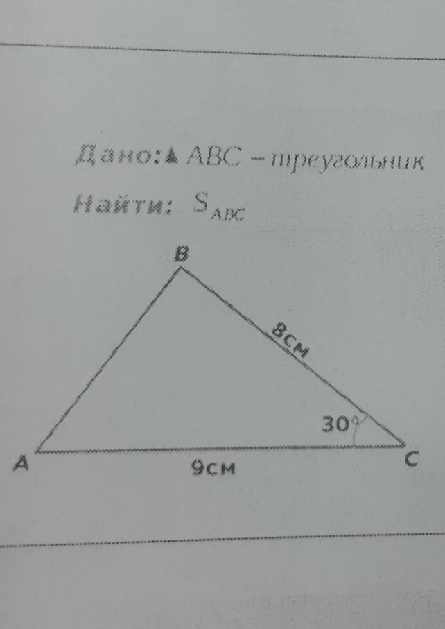 проводишь высоты из вершины B на сторону АС в точку H. рассмотрим треугольник BHC, где BC является гипотенузой. катет BH, лежащий против угла в 30 градусов равен половине гипотенузы = 4, дальше по формуле площади S = 1/2 * BH * AC = 18