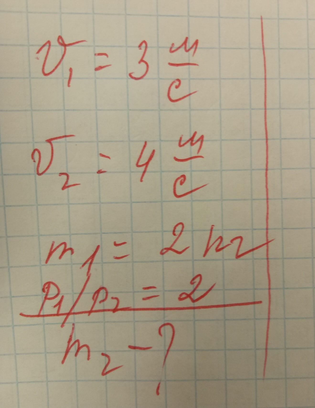 m1V1/m2V2= 2 m2=m1V1/V2*2 = 3*2/2*4 = 6/8 = 3/4 кг = 0.75 кг
