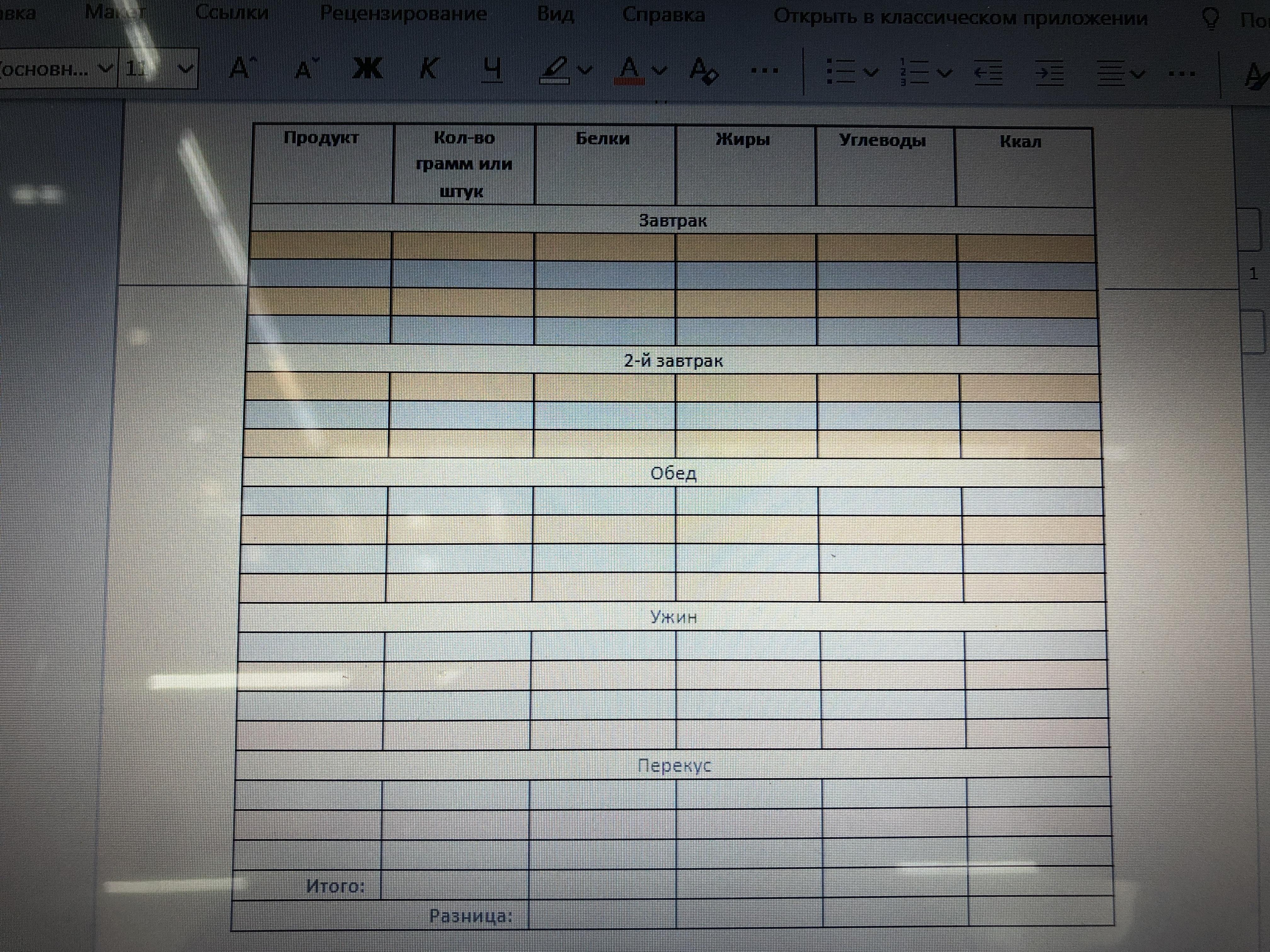 Количество ккал, белков, жиров и углеводов должно по итогу совпасть с данными значениями: