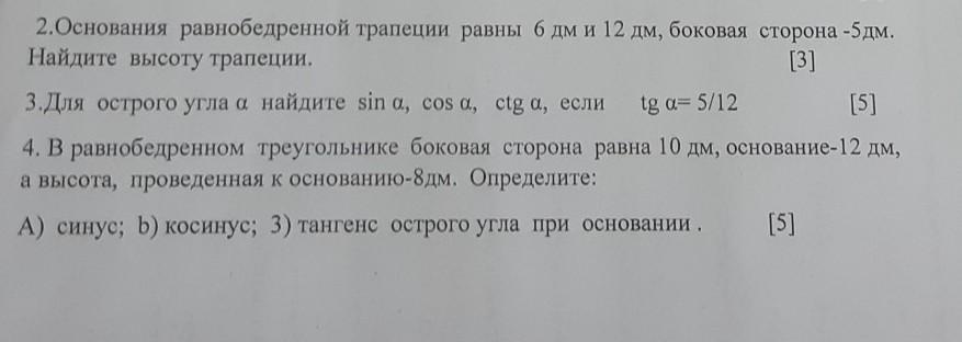 Во 2. надо провести обе высоты из вершин меньшего основания, они отсекут от большего основания два равных отрезка по 3дм, что образуют в боковой стороной и высотой пифагоров треугольник, отношение сторон которого 5:4:3, значит высота равна 4дм