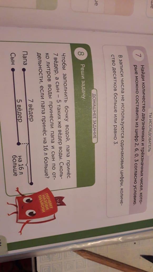 Ответ: Папа принёс 56л воды,а сын 40л воды