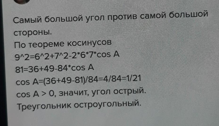 Стороны треугольника соответственно равны 6 см, 7 см и 9 см. Найди косинус большего угла треугольника.