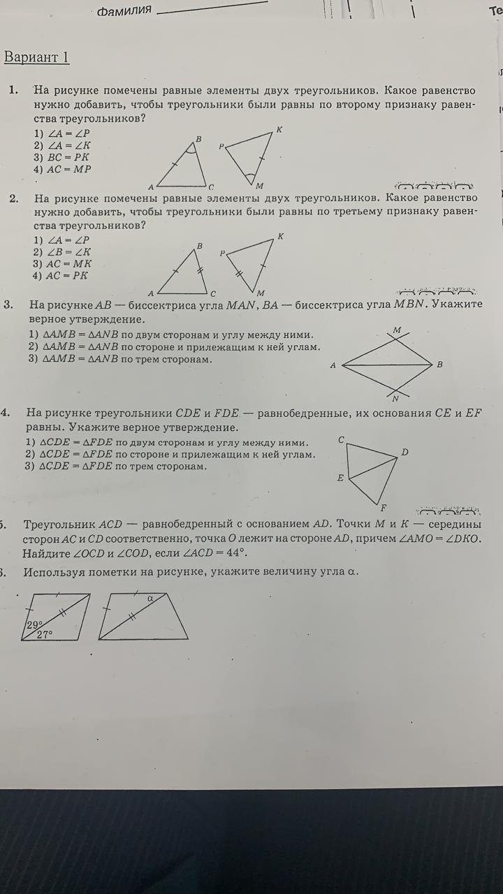 На рисунке помечены равные элементы двух треугольников. Какое равенство нужно добавить, чтобы треуг были равны 2 теории