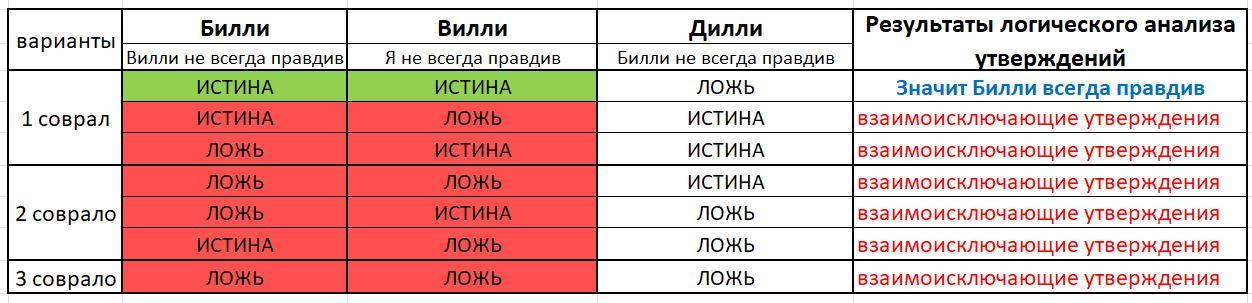 1) двое сказали правду, 1 соврал (3 варианта)