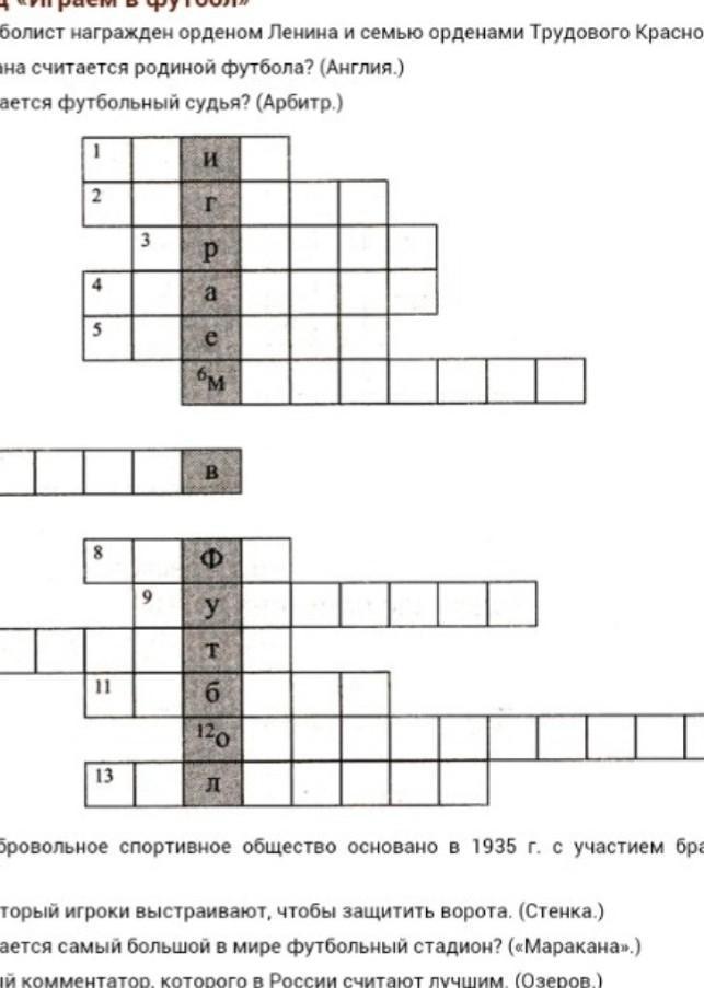 6. Кроссворд «Играем в футбол» 1. Какой футболист награжден орденом Ленина и семью орденами Трудового Красного Знамени? (Яшин.) 2. Какая страна считается родиной футбола? (Англия.) 3. Как называется Какое добровольное спортивное общество основано в 1935г. с участием братьев Старостиных? («Спартак».) 5. Заслон, который игроки выстраивают, чтобы защитить ворота. (Стенка.) Как называется самый большой в мире футбольный стадион? («Маракана».) 7. Футбольный комментатор, которого в России считают лучшим. (Озеров.) 8. Международная федерация футбола. (ФИФА.) 9. Три защитника и два полузащитника против пяти нападающих. (Дубль-ве.) 10. Штрафной 11-метровый удар. (Пенальти.) 11. Игрок, находящийся позади защитников и готовящий начало атаки. (Либеро.) 12. Сколько игроков в футбольной команде? (Одиннадцать.) 13. Защитник ворот. (Голкипер.)