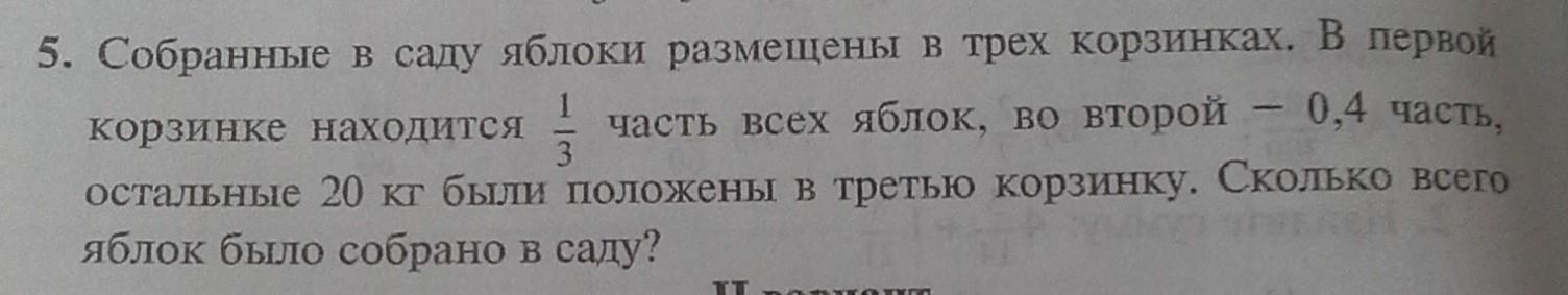 20 кг = 1 - 1/3 - 4/10 часть от всех яблок