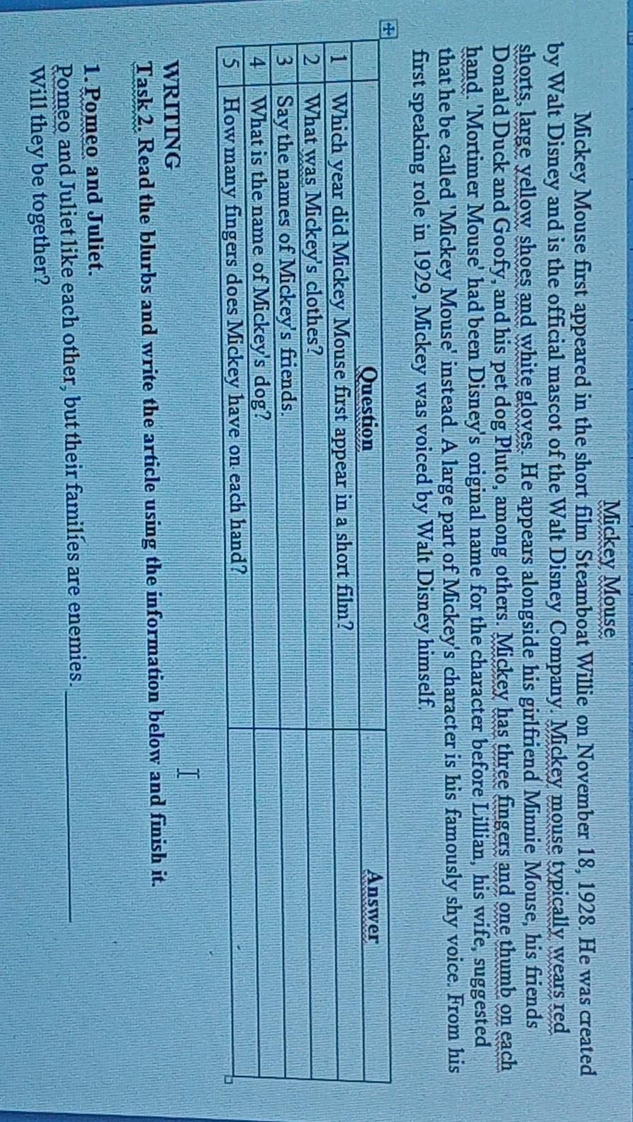 2) Mickey’s clothes was red shorts, large yellow shoes and white gloves.