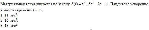 Материальная точка движется по закону S(t)=t^3+5t^2-2t+1 . Найдите ее ускорение в момент времени t=1c