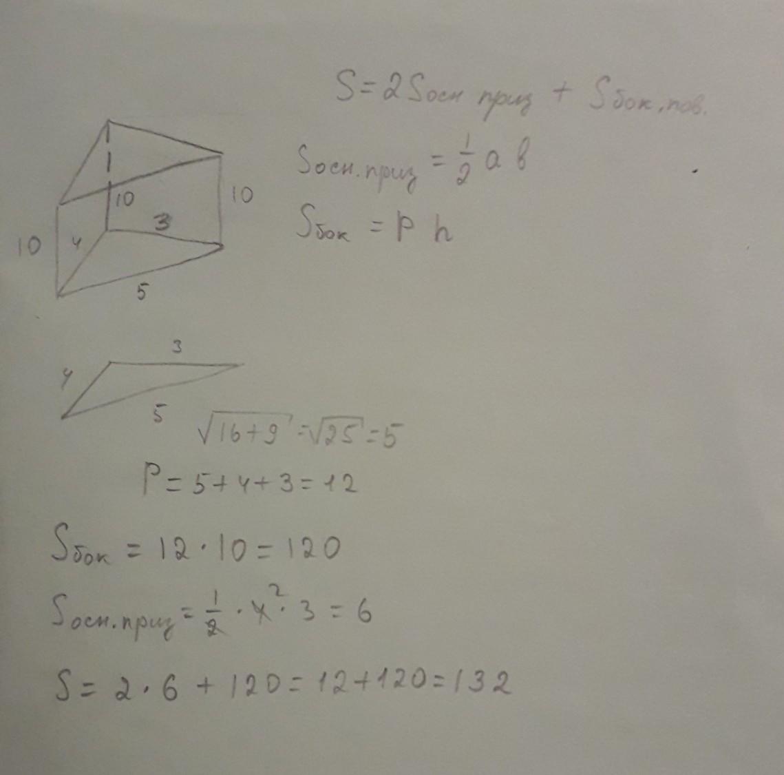 В основе прямой призмы лежит прямоугольный треугольник, катеты которого равны 4 см и 3 см. Найти площадь полной поверхности призмы. Если ее боковое ребро равно 10 см.