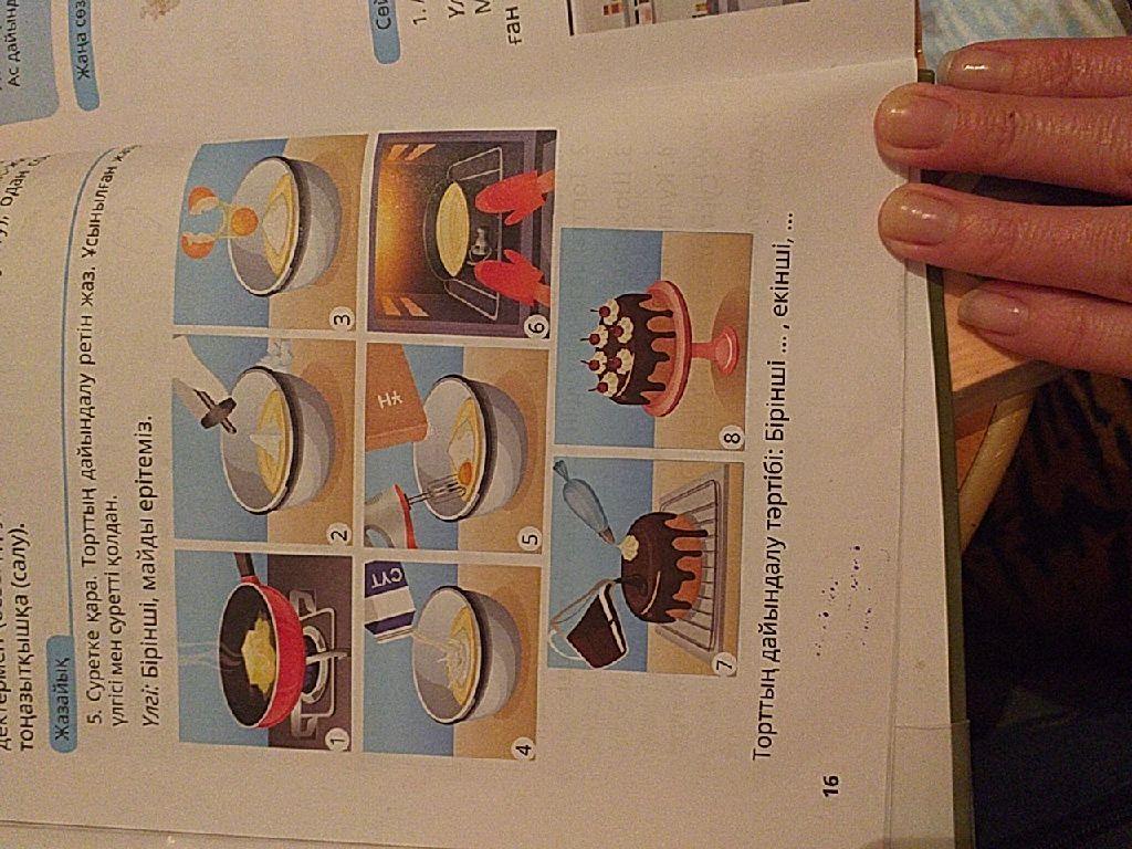 Объяснение:бірінші,майды ерітеміз. Екінші, майға қант қосамыз. Үшінші, жұмыртқаны жарып қосамыз. Төртінші, сүт қосамыз. Бесінші,осы қоспаға ұн қосамыз. Жақсылап араластыруды ұмытпаймыз. Алтыншы, қызып тұрған пешке саламыз. Жетінші,піскен торттың үстіне шоколад құямыз. Сегізінші,тортымызды шиемен әрлейміз