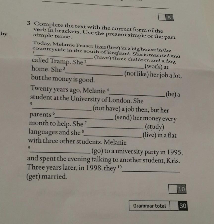 1. Had 2.works 3.don't likes 4.was 5.haven't 6.sends 7.studies 8.lives 9.went 10.got