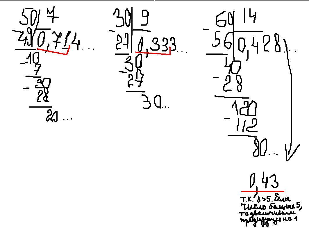 Выразите 5/7 3/9 6/14 приблеженно десятичной дробью с двумя знаками после запятой (покажите вычисления)