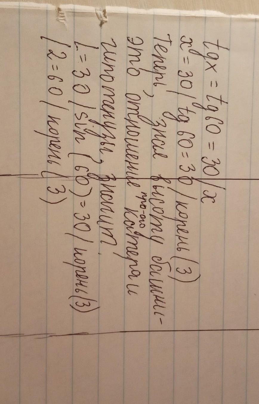 Вертикальная башня высотой 30 м видна из точки К на поверхности земли под углом 60°. Найдите расстояния от точки К до основания башни и до самой высокой точки башни.