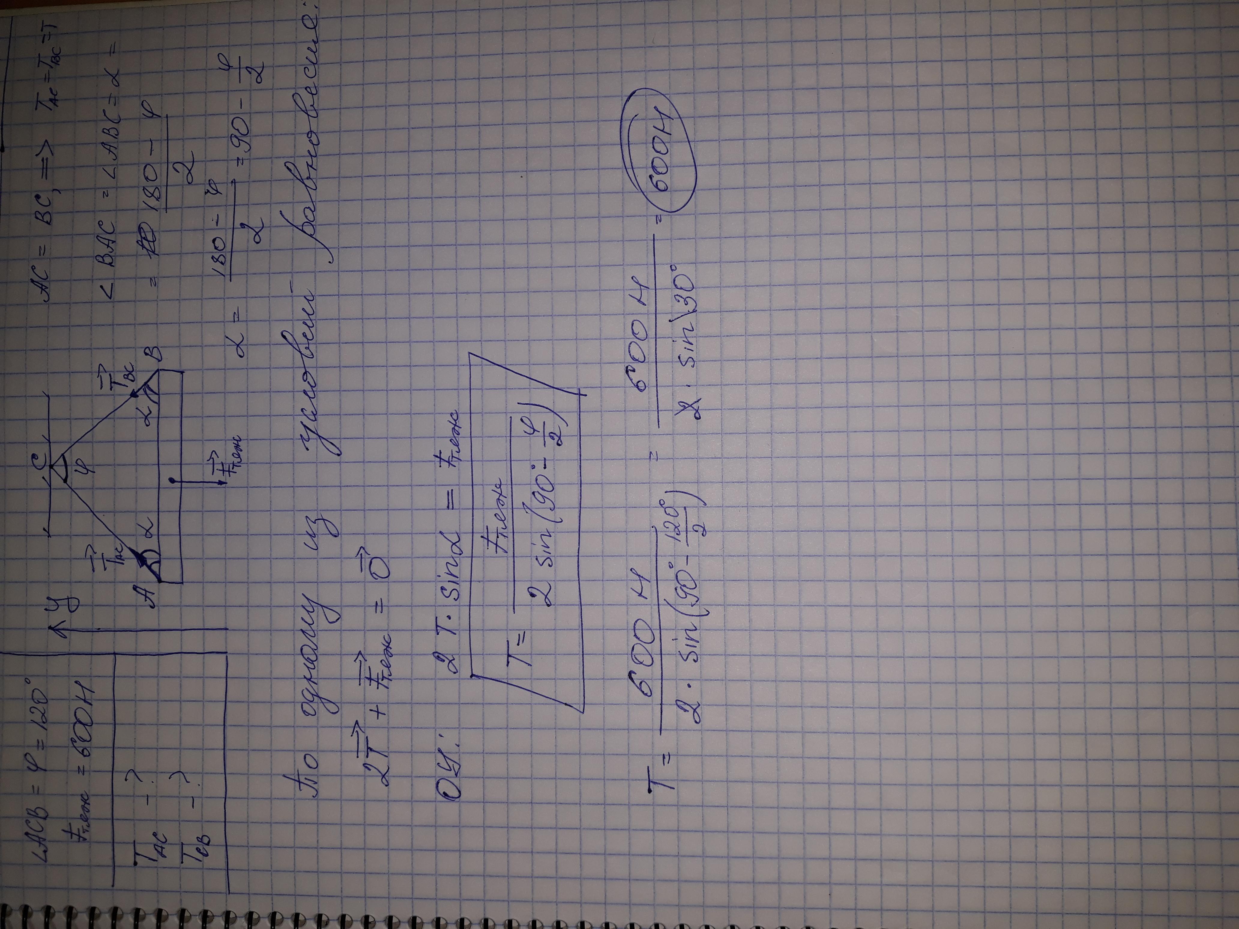 Груз висит на двух тросах. Угол ACB равен 120. Силы тяжести, Действующая на груз, равна 600Н. Определите силы натяжения тросов АС и СВ