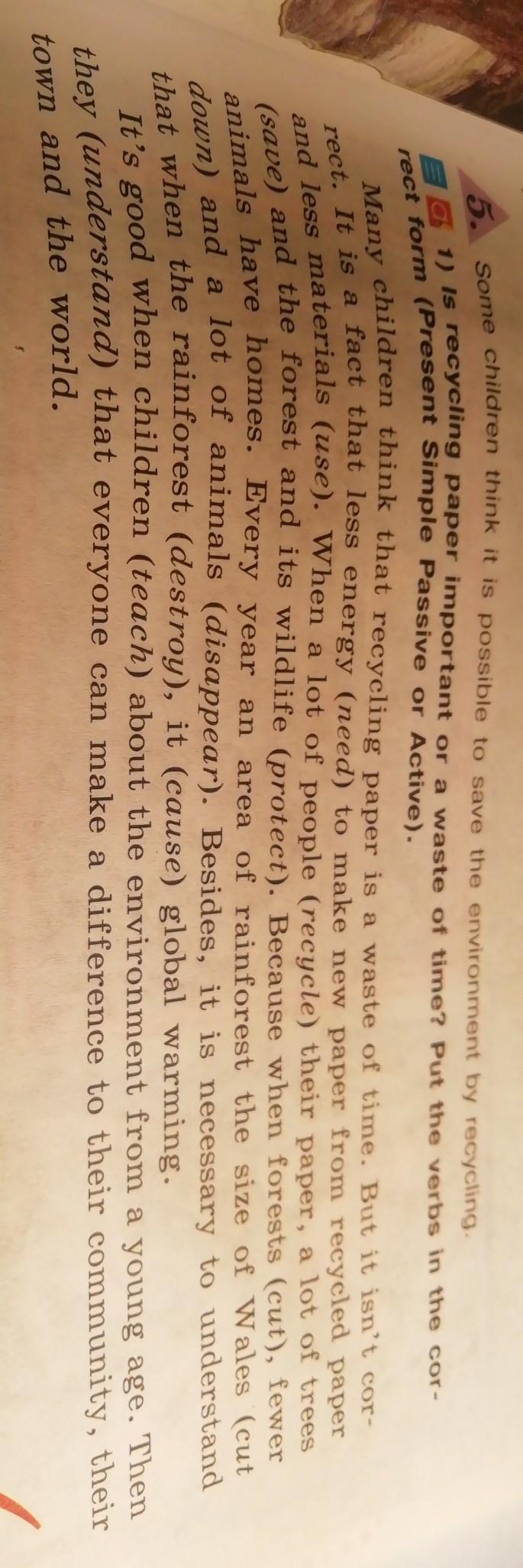 Некоторые дети думают, что можно спасти окружающую среду, перераспределяя бумагу для вторичной переработки, важно или трата времени? Поместите глаголы в правильной форме (Present Simple Passive или Active). Дети Кени считают, что переработка бумаги - пустая трата времени. Но это не тот факт, что меньше энергии (необходимость), чтобы сделать новую бумагу из переработанных бумажных материалов углубления (использование). Когда много людей (перерабатывают) свою бумагу, много деревьев пр.) И лес и его дикая природа (защита). Потому что, когда леса (рубить), меньше животных имеют дома. Каждый год пух) и много животных (исчезают). Кроме того, необходимо понимать, что когда тропический лес (разрушать), он (вызывает) глобальное потепление. Хорошо, когда дети (учат) об окружающей среде с юных лет. Затем площадь тропических лесов размером с Уэльс (вырежьте они (понимают), что каждый может изменить мир к своему сообществу, своему городу и миру).