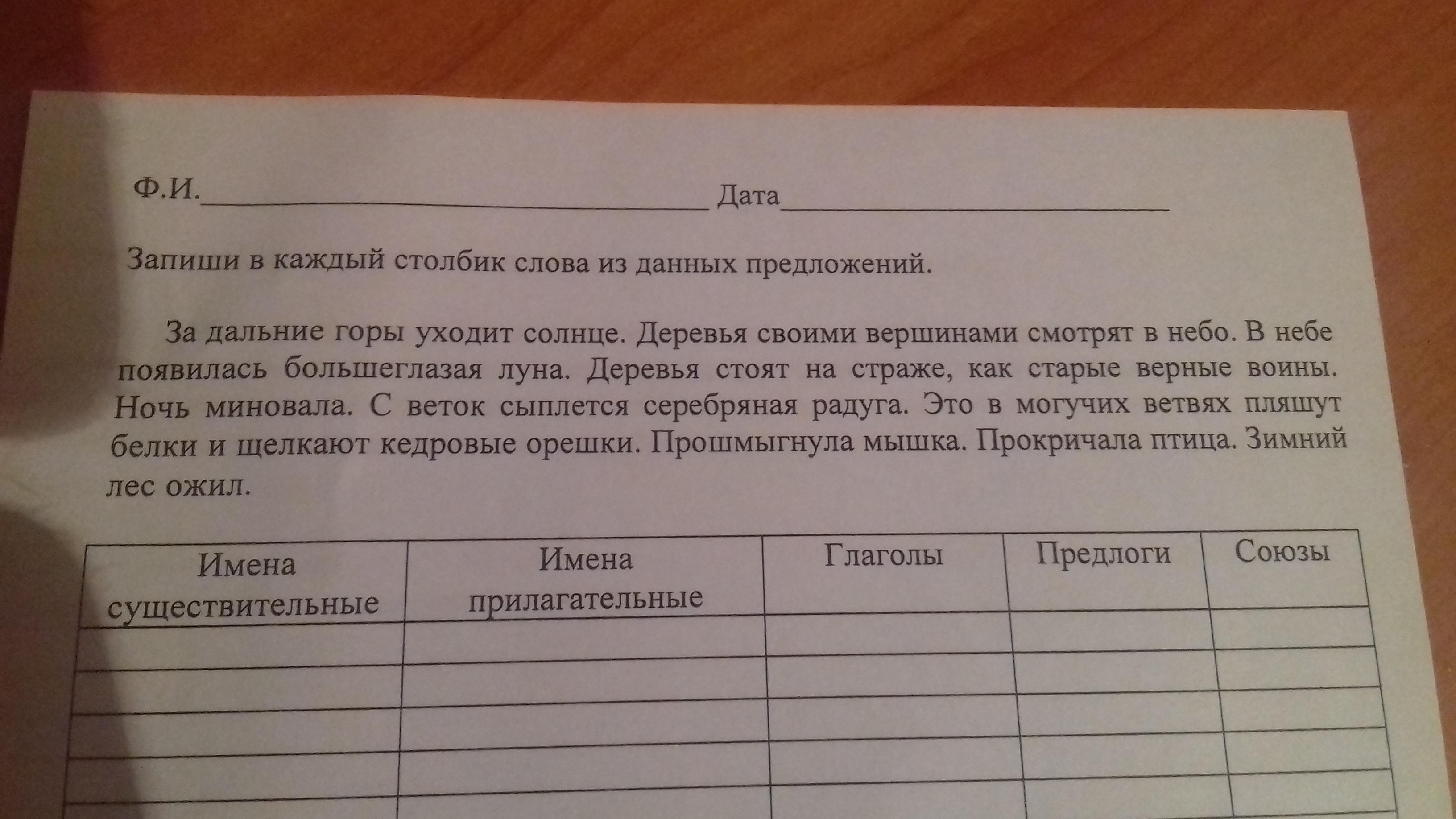 сущ: горы солнце деревья вершинами небо луна страже воины ночь веток радуга ветвях белки орешки мышка птица лес