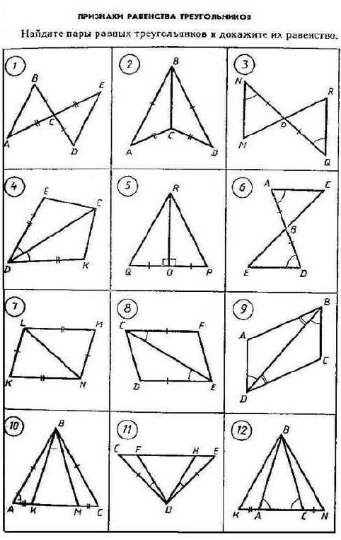 1 по 2 сторонам и углу между ними,2 по трем сторонам, 3 по двум углам и стороне между ними, 4 по двум сторонам и углу между ними,5 по двум сторонам и углу,6 по двум углам и стороне между ними,7 по 3 сторонам,8 по2 сторонам и углу между, 9 по сторонеи углам между ними. 10 не понял, 11 по двум сторонам и углу между ними. 12 не понял.