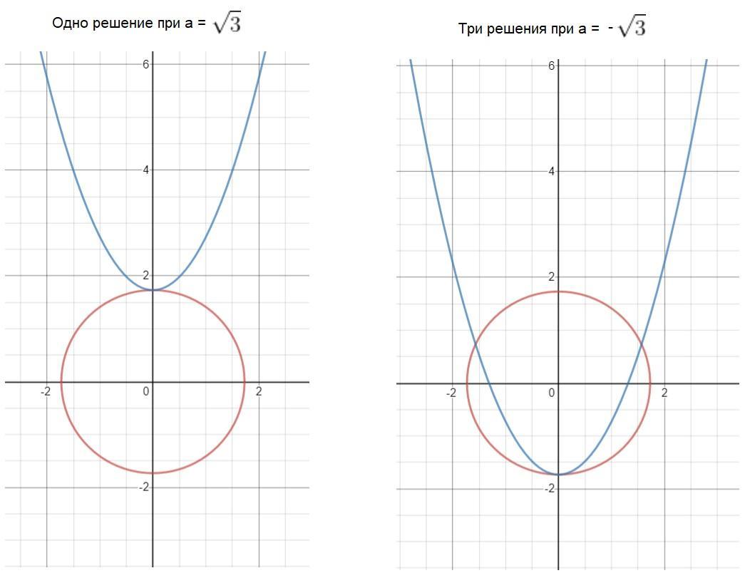 Первое уравнение системы задает окружность с центром в начале координат и радиусом √3. Второе уравнение это парабола y = x², сдвинутая по оси ординат на a вверх, если a > 0 или на a вниз, если a < 0. Строим графики, из которых становится видно, что единственное решение система будет иметь при a = √3, соответственно три решения при a = -√3.