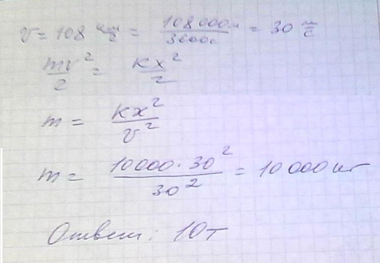 Самолет садится на палубу авианосца, имея скорость 108 км/ч.Зацепившись за упругий канат торможения, он пробегает 30 м до остановки. Найти массу самолета, если коэффициент упругости каната торможения равен 10 кН/м.