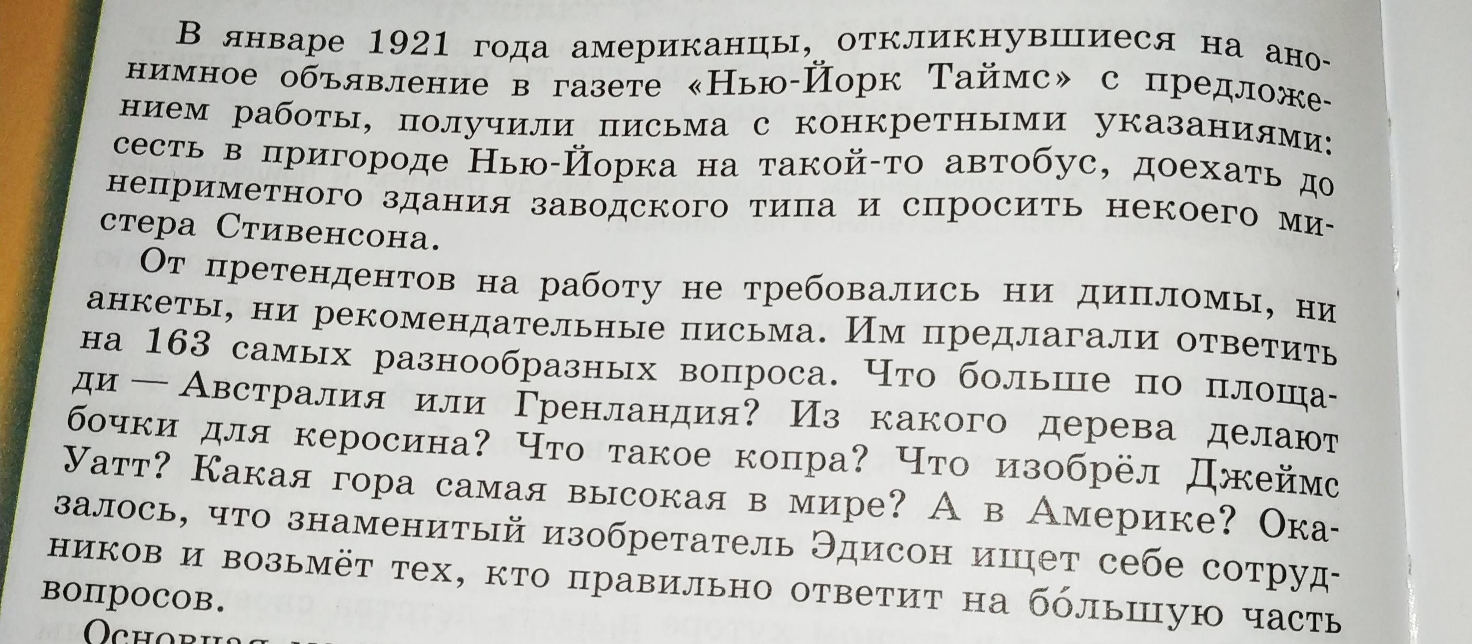 Оказалось, что знаменитый изобретатель Эдисон ищет себе сотрудников и возьмёт тех, кто правильно ответит на большую часть вопросов.