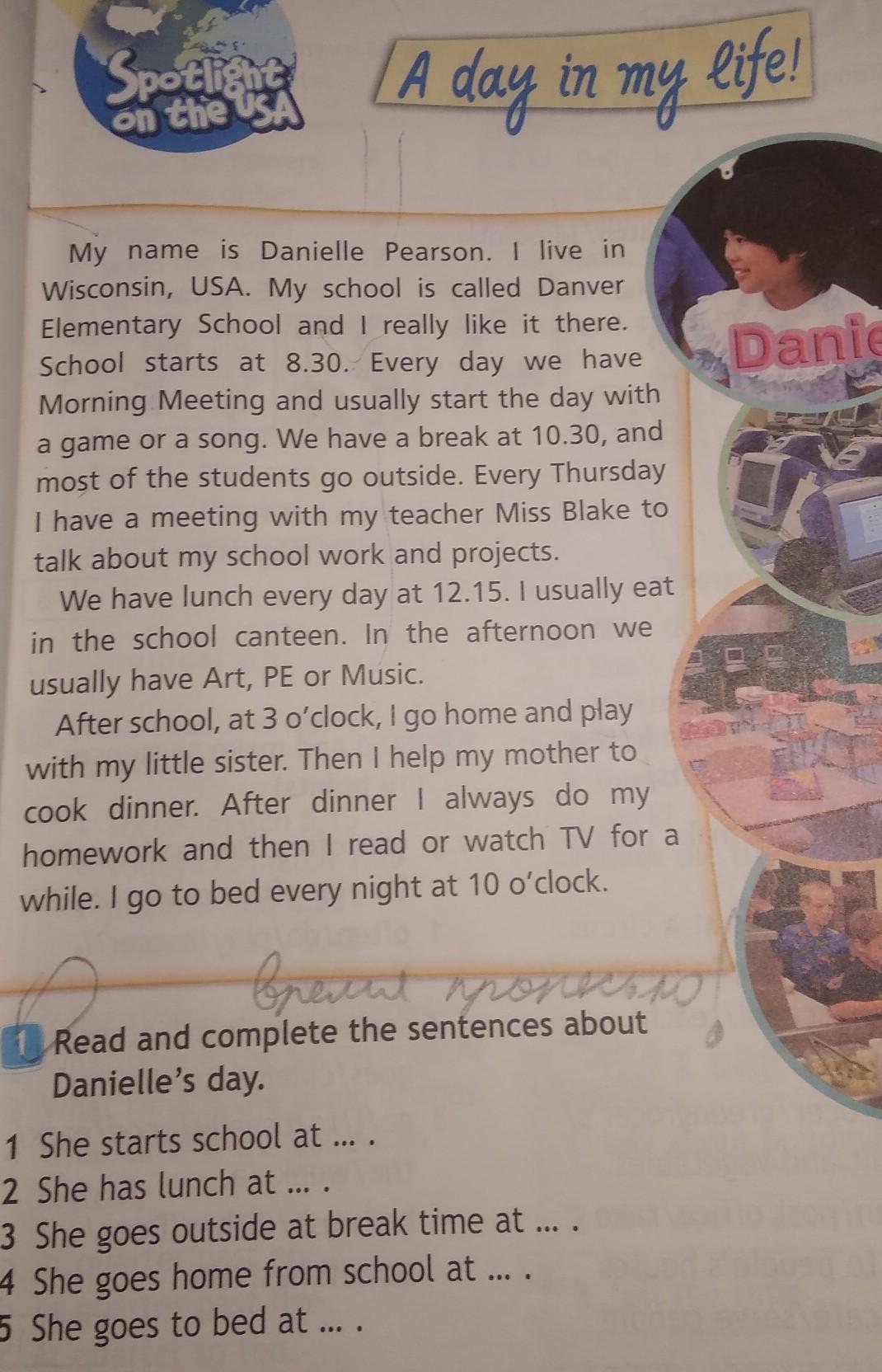 4. she goes home from school at three p.m. (3 o'clock)