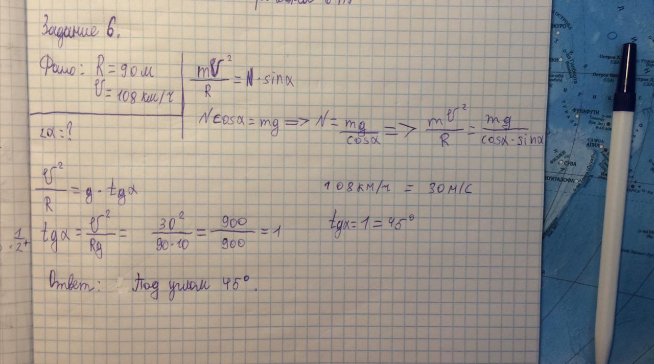 Под каким углом следует наклонить дорожное полотно, чтобы автомобиль даже на обледенелой дороге мог входить в поворот радиусом 90 м на скорости 108 км/ч?