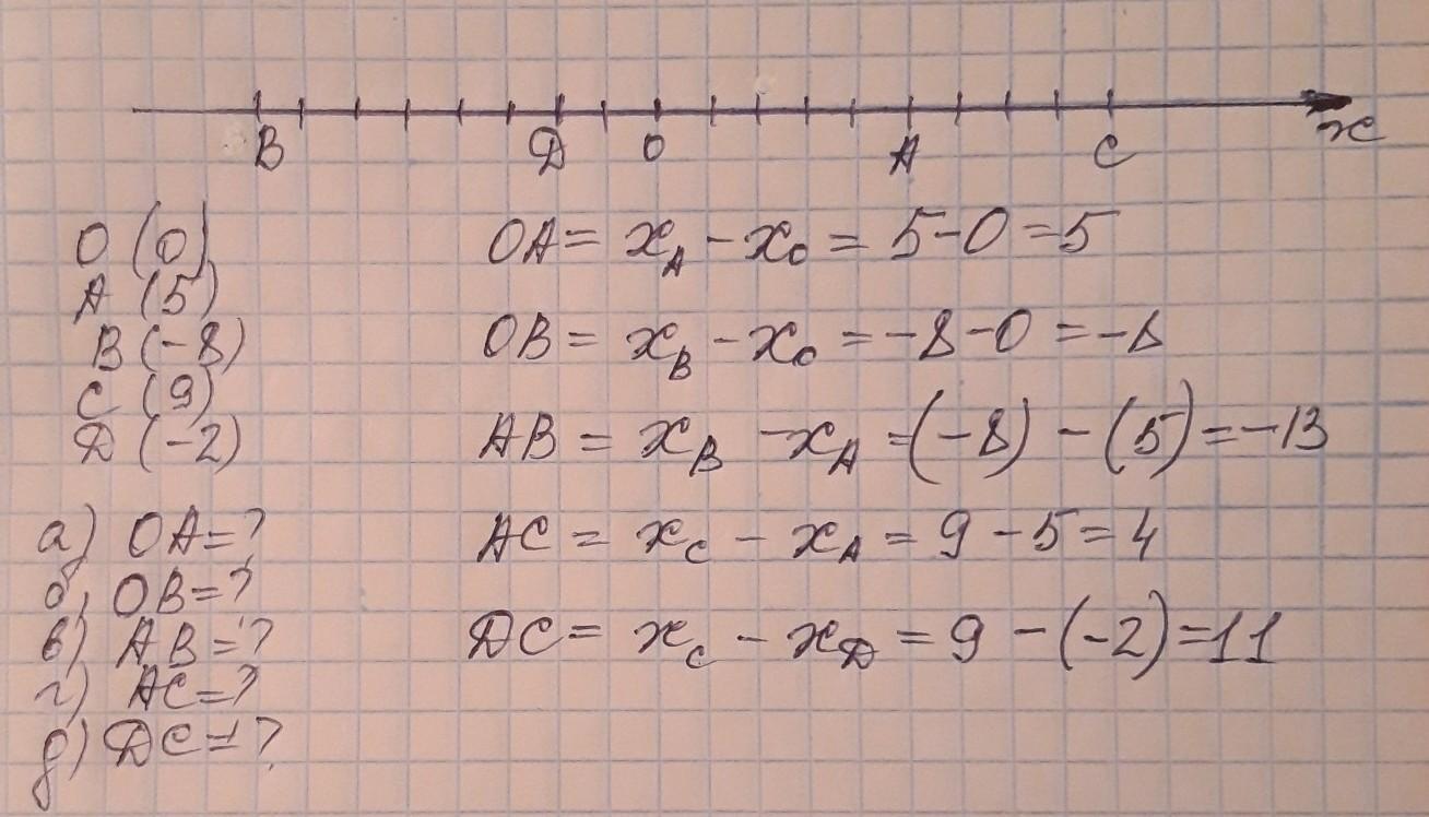 изобразите координатную ось. отметьте на ней точки О(0), А(5), В(-8), С(9), D(-2). вычислите длину отрезка. а)ОА, б)ОВ, в)АВ, г) АС, д) DC