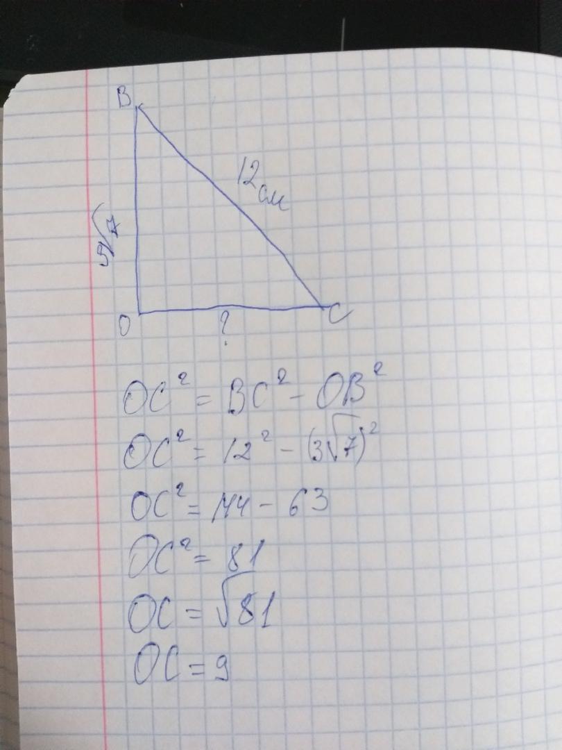 в прямоугольном треугольнике ВОС большая сторона равна 12 см , одна из двух других равна 3 корень 7 см . найдите третью сторону