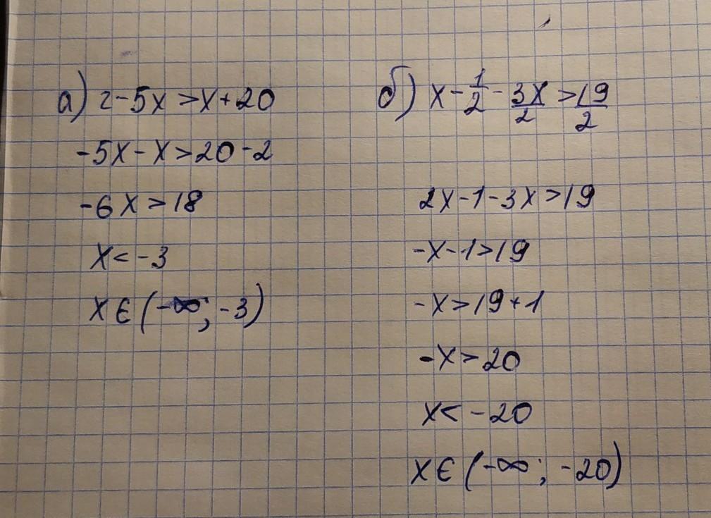 a) 2-5x>x+20 б) x-1/2 - 3x/2 >3x+19/2