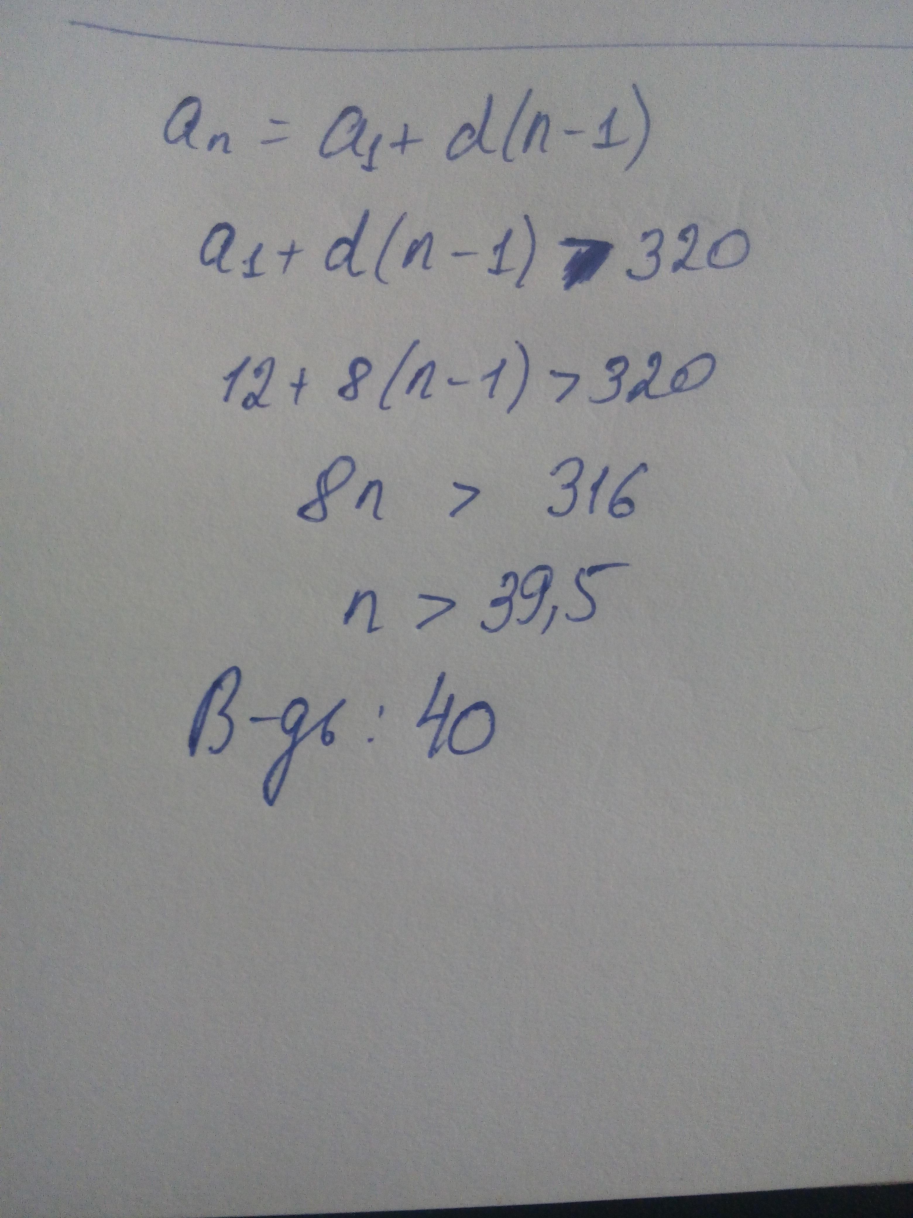 Помогите пожалуйста кто знает математику. первый член арифметической прогрессии равен 12 а её разность равна 8. Начиная с какого номера члены этой прогрессии больше 320. Срочнооооо!