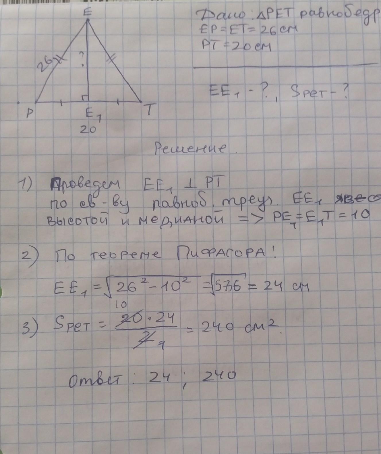 в равнобедренном треугольнике РЕТ боковая сторона равна 26 см , основание равно 20 см . найдите высоту треугольника и его площадь