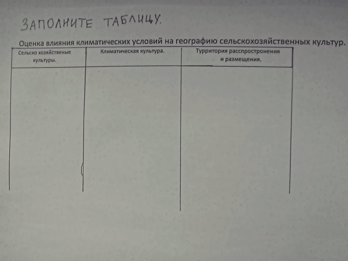 Заполните таблицу по географии. " Оценка влияния климатических условий на географию сельскохозяйственных культур ".