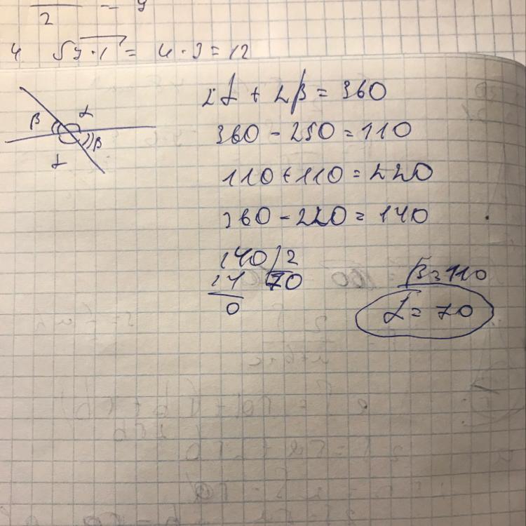 Сумма трех углов образованных при пересечении 2 прямых равна 250 градусов.Найти меньший из этих углов