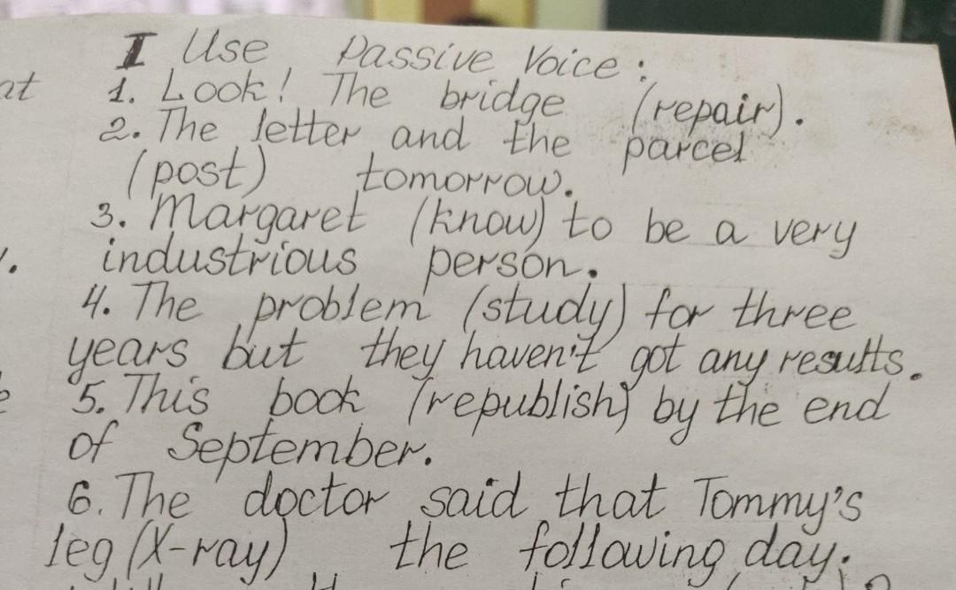 1 is being repaired 2 will be posted 3 is known 4 has been studied 5 will have been republished 6 would be X-rayed.