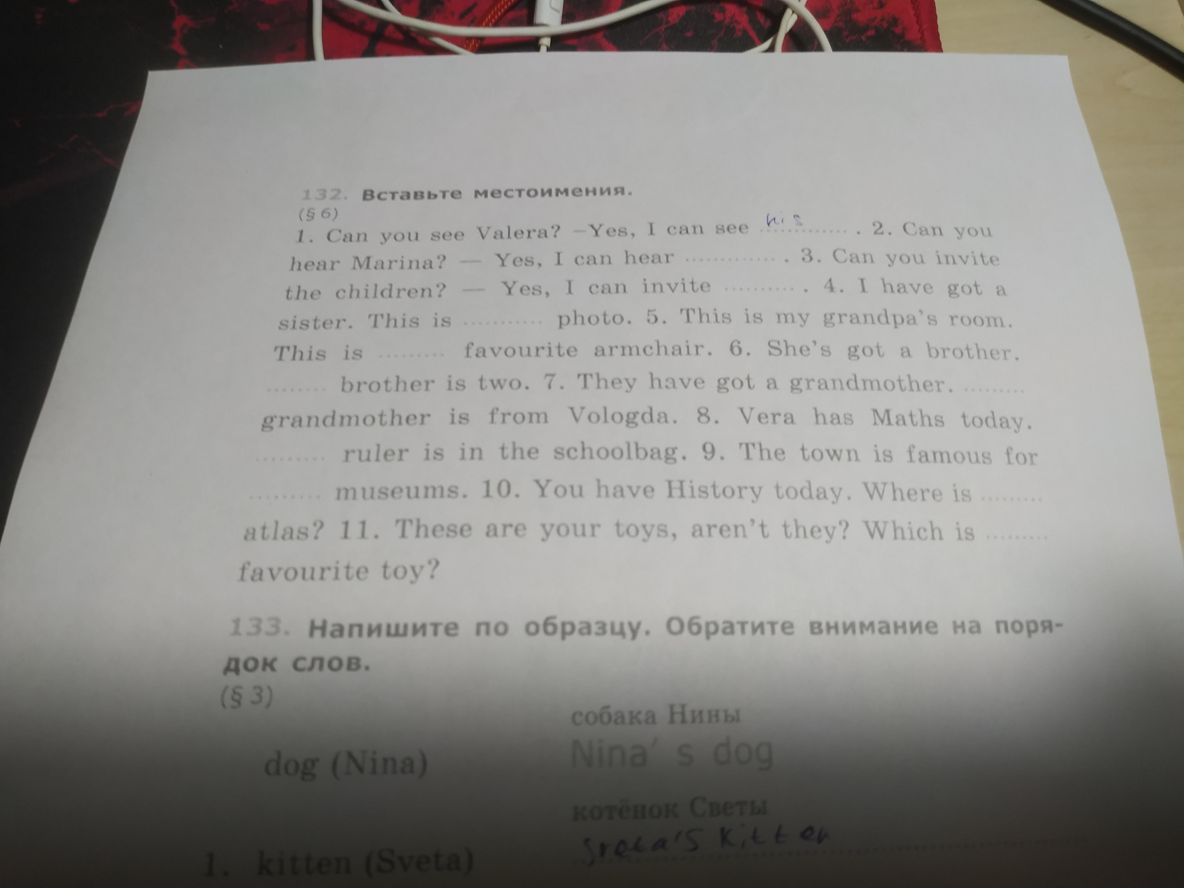 1. Can you see Valera? — Yes, I can see him. 2. Can you hear Marina? — Yes, I can hear her. 3. Can you invite the children? — Yes, I can invite them. 4. I have got a sister. This is her photo. 5. This is my grandpa's room. This is his favourite armchair. 6. She's got a brother. Her brother is is two. 7. They have got a grandmother. Their grandmother is from Vologda. 8. Vera has Maths today. Her ruler is in the schoolbag. 9. The town is famous for its museums. 10. You have History today. Where is your atlas? 11. These are your toys, aren't they? Which is your favourite toy?