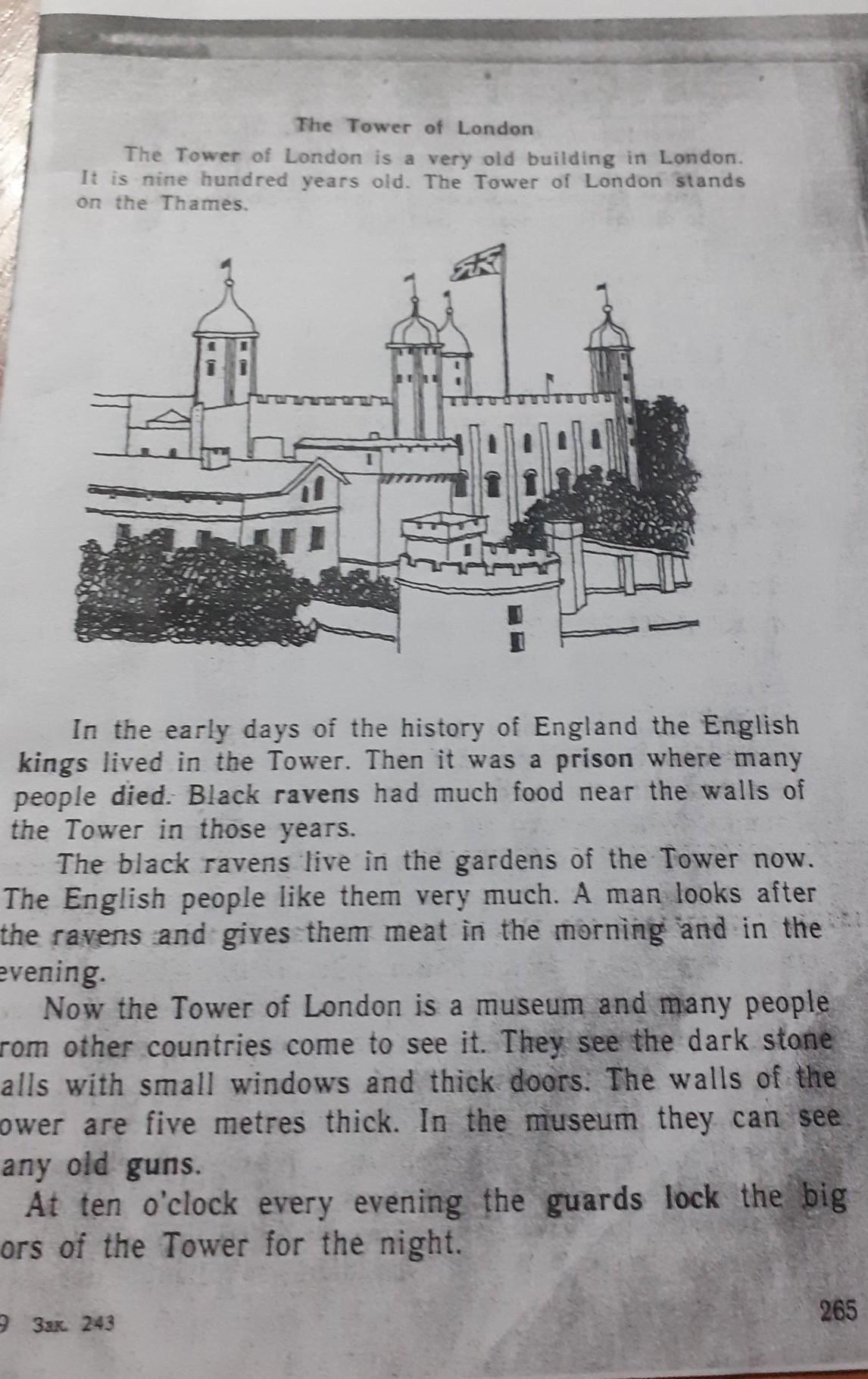 Тогда это была тюрьма, где погибло много людей. В те годы у черных воронов было много еды возле стен Башни. Черные вороны теперь живут в садах Башни. Они очень нравятся англичанам. Мужчина присматривает за воронами и дает им мясо утром и вечером. Теперь Лондонский Тауэр является музеем, и многие люди из других стран приезжают, чтобы увидеть его. Они видят темный камень с небольшими окнами и толстыми дверями. Стены Ауэра имеют толщину пять метров. В музее они могут увидеть любые старые пушки. В десять часов вечера каждый вечер охранники закрывают большие башни.