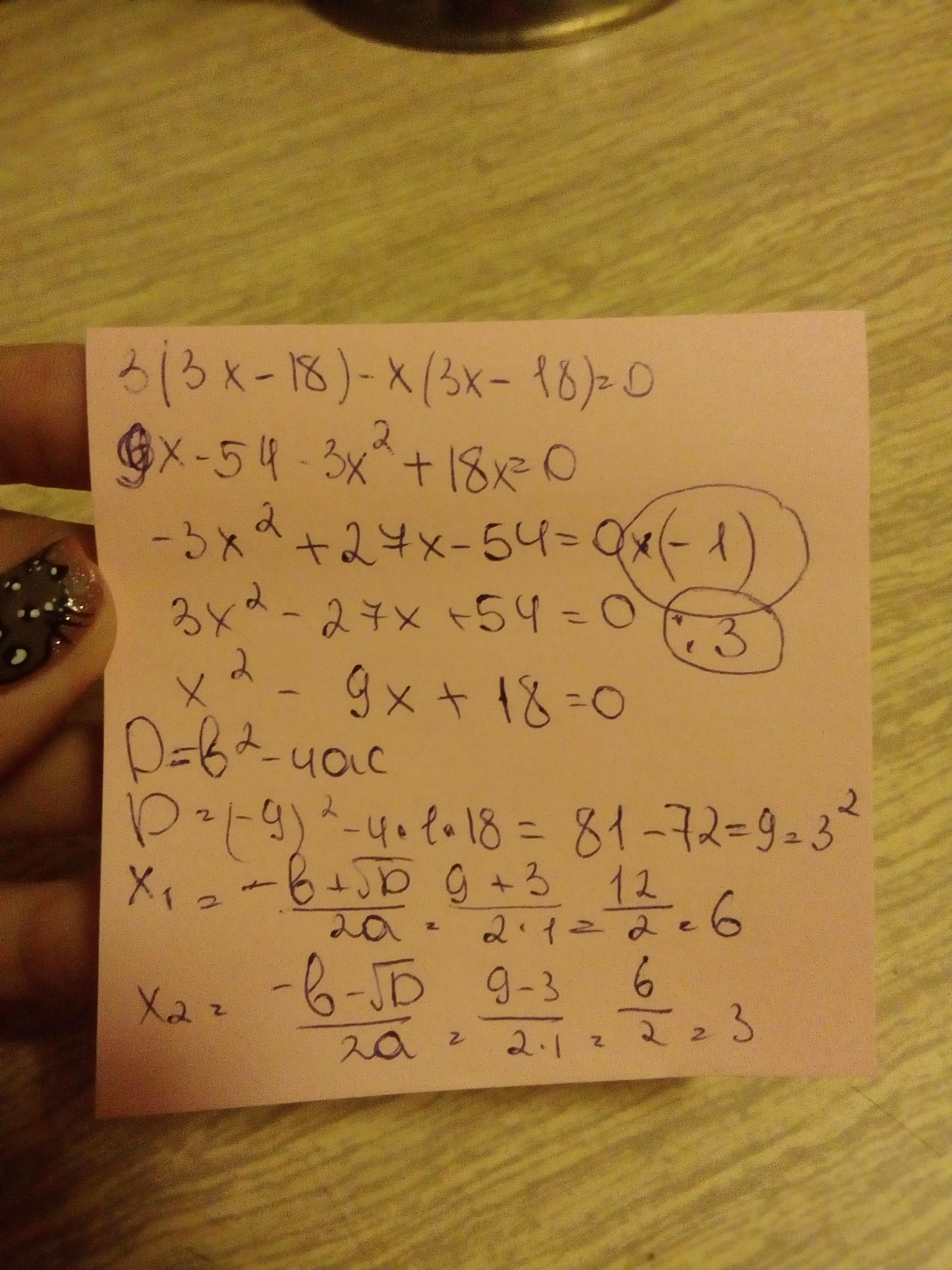 (3x-18)*(3-x)=0, 3x-18=0 или 3-x=0, x1= 6, x2=3. все. без усложнений
