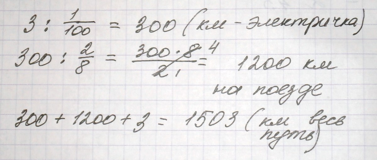 Из города до деревни сначала надо ехать на поезде, затем две восьмых частил этого расстояния надо проехать на электричке , а потом от станции еще 3 километра до деревни надо пройти пешком, что составляет сотую часть от расстояния, проделанного на электричке. Найди расстояние от города до деревни??