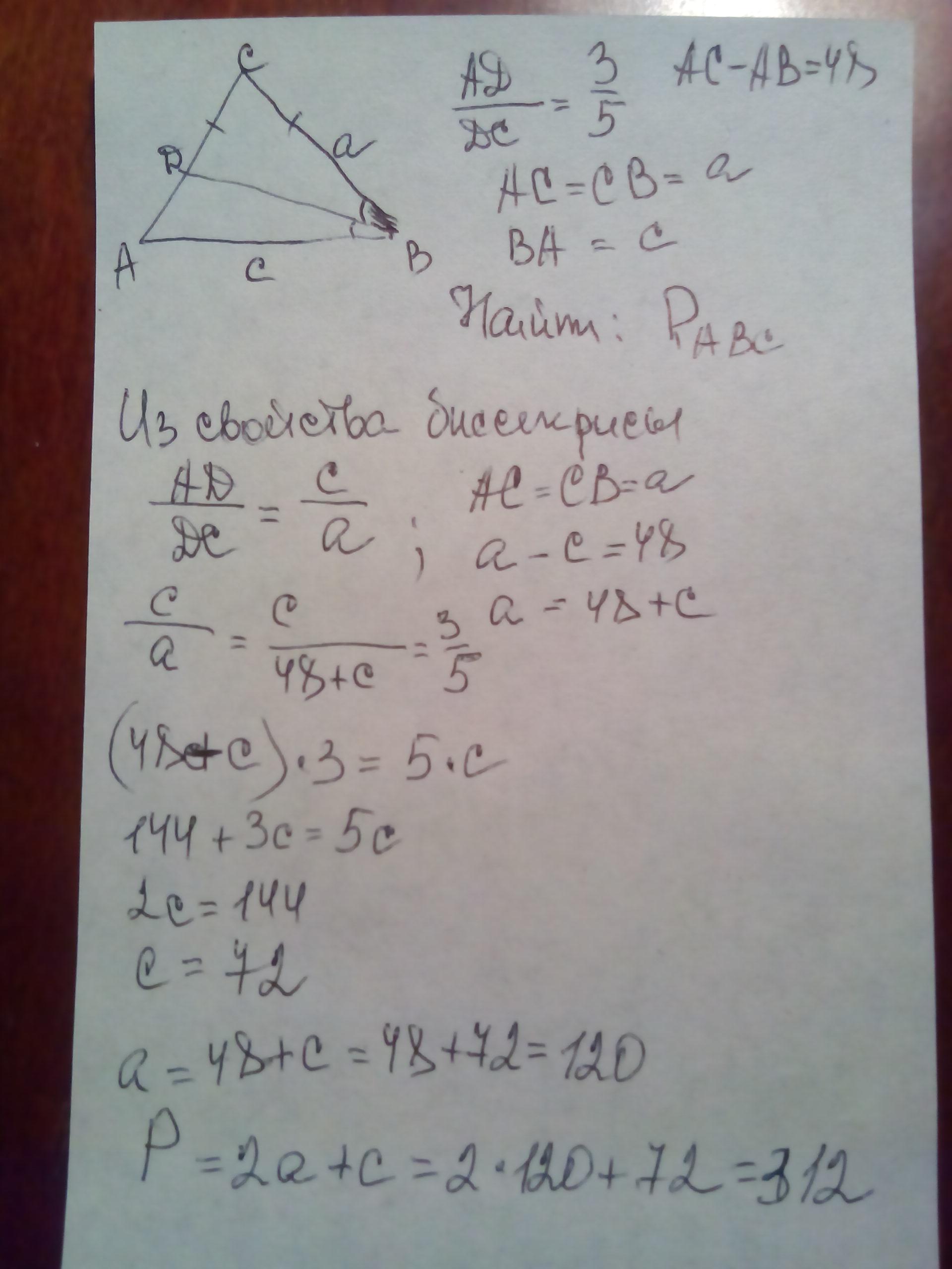 Биссектриса BD равнобедренного треугольника ABC (AC=BC) делит сторону AC в отношении 3:5, считая от вершины A. Найдите периметр треугольника ABC, если известно , что AC-AB=48.