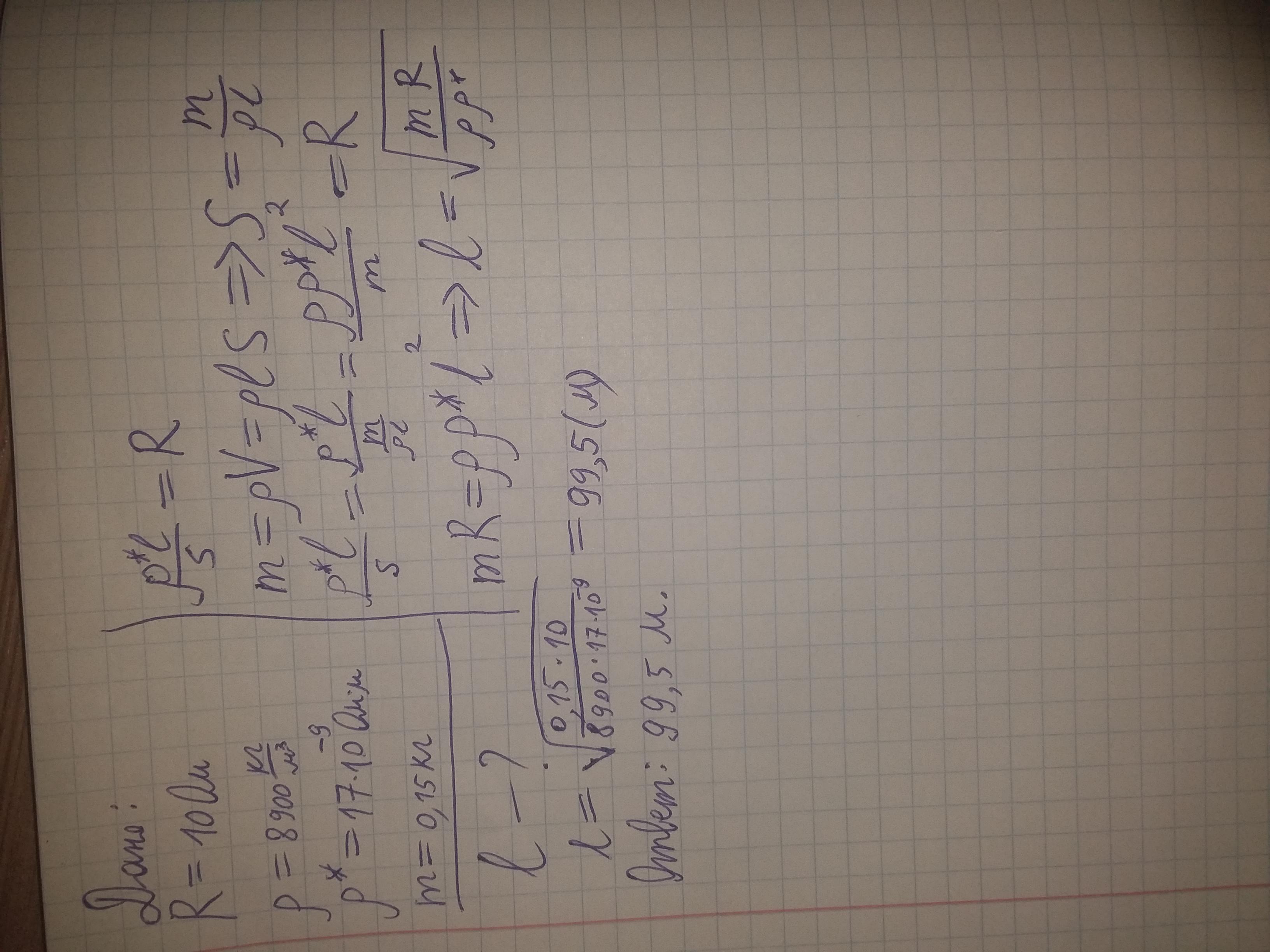 Тонкую проволоку изготавливают из металлического прутка путем протягивания через калиброванное отверстие ( «волочением»). Найти длину проволоки если её сопротивление равно 10 Ом; густота прутка 8,9 г/см³, удельное сопротивление 17нОм*м, масса 150г.