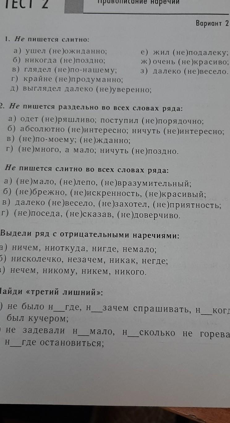 - а) одет неряшливо ; поступил не порядочно Б) абсолютно не интересно;ничуть неинтересно; В) не по-моему; нежданно; Г) немного, а мало ; ничуть не поздно