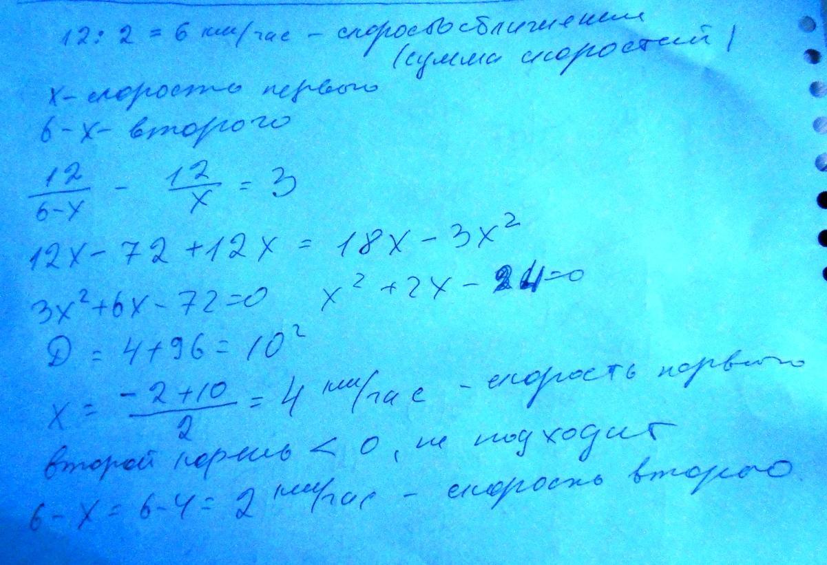 Из двух сел, расстояние между которыми 12 км, отправились одновременно навстречу друг другу два пешехода, которые встретились через 2 часа. Найдите скорость каждого из них, если один из пешеходов потратил на весь путь на 3 часа больше, чем другой.
