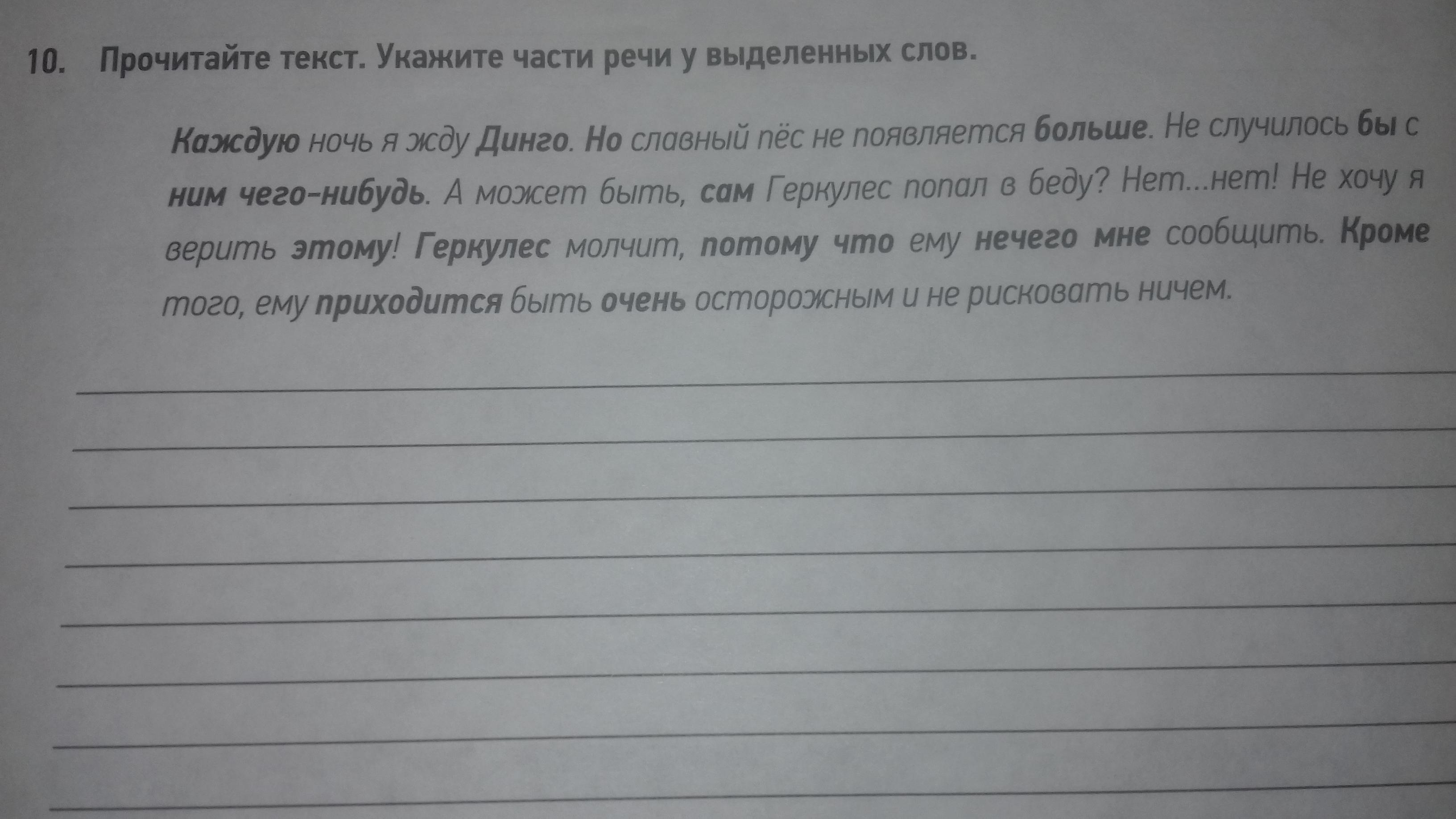 Каждую- прилагательное, Динго- существительное, но- союз, больше- прилагательное, бы- частица, ним- местоимение, чего- нибудь местоимение, сам- местоимение, этому- местоимение, геркулес- существительное, потому- местоимение, что- местоимение, нечего- местоимение, мне- местоимение, кроме- предлог, приходится- глагол, очень- наречие.