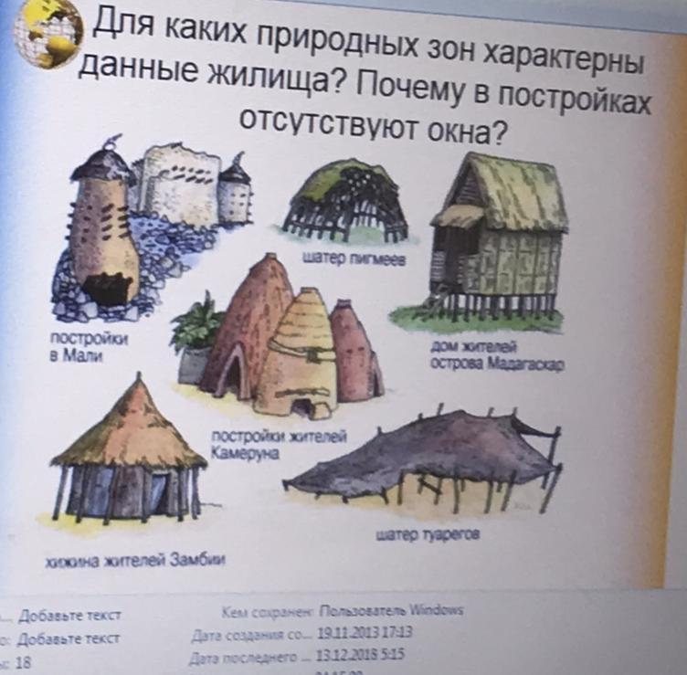 Основная часть жизни африканцев проходит на открытом воздухе, дом же нужен в основном для ночлега и укрытия от непогоды. По этой причине основная масса традиционных африканских жилищ не имеет окон.
