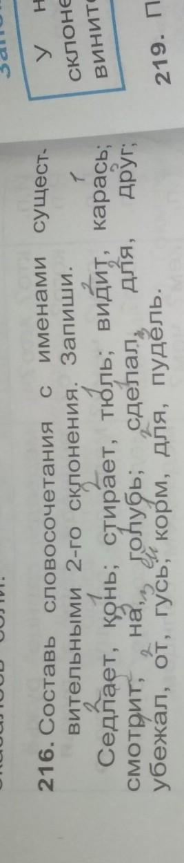 Словосочетания: Седлает коня; Стирает тюль; Видит карася; Смотрит на голубя; Сделал для друга; Убежал от гуся; Корм для пуделя